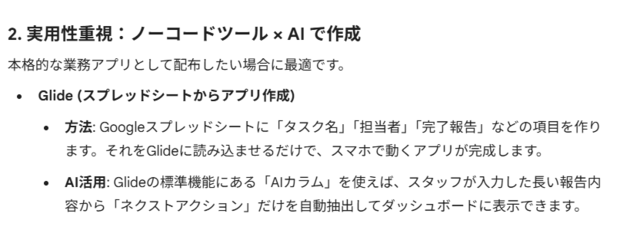 「AIを使ってスマホで確認できるアプリを作成したいです。 営業部のToDo管理を行いたくて、タスクに対しての完了・未完了が一目でわかるようにしたいです。 オススメの方法を教えてください。」